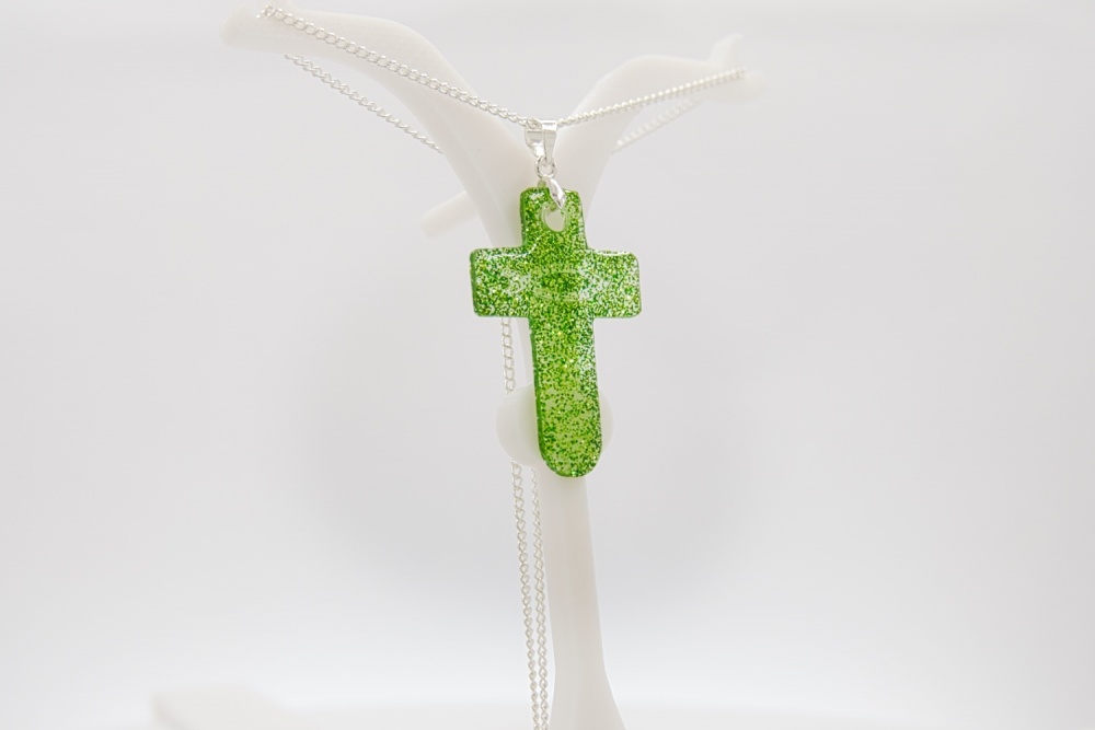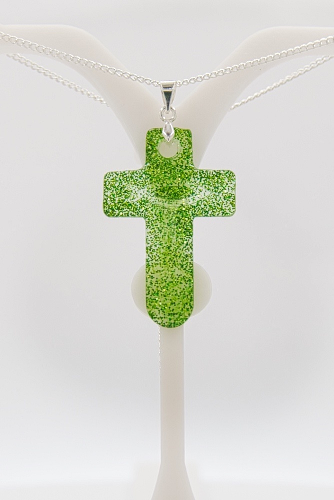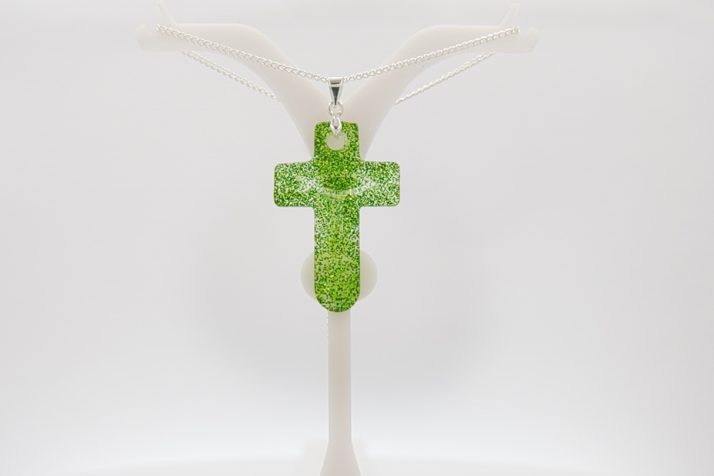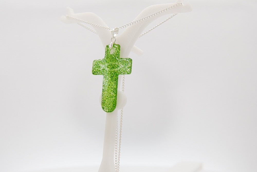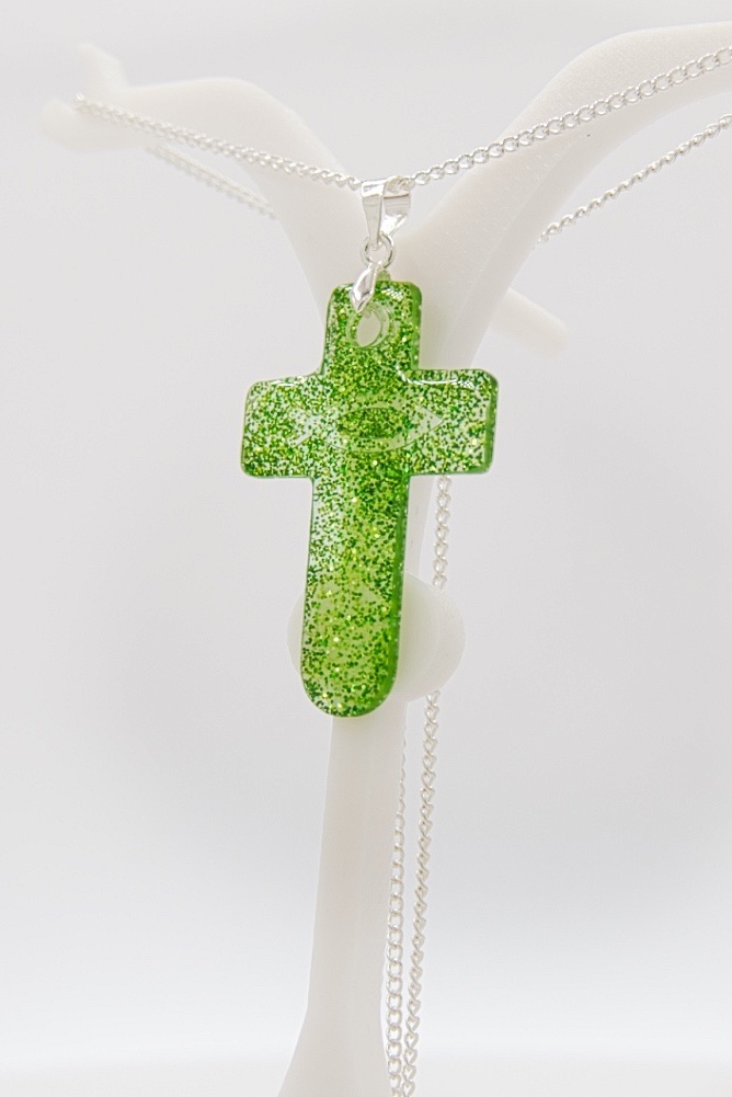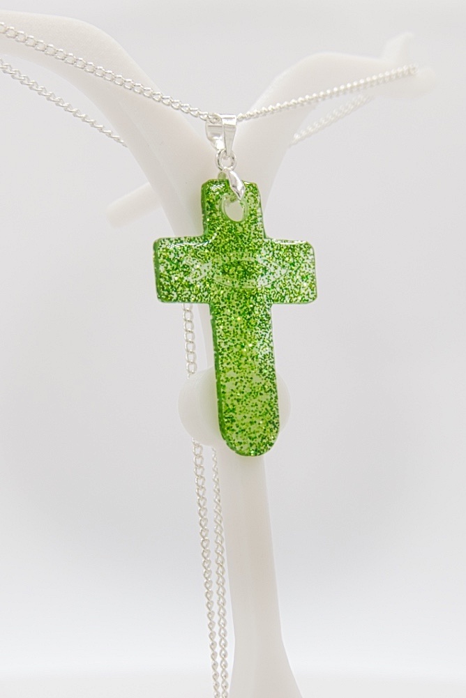 Dieses grünglitzernde Kreuz mit Fischsymbol ist bildschön und ein Einzelstück.