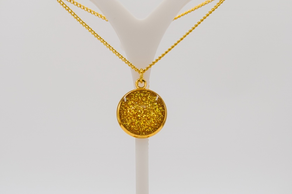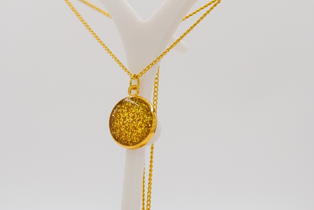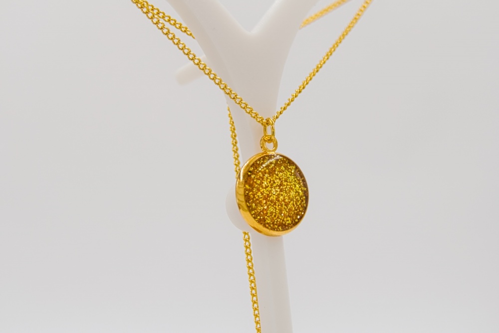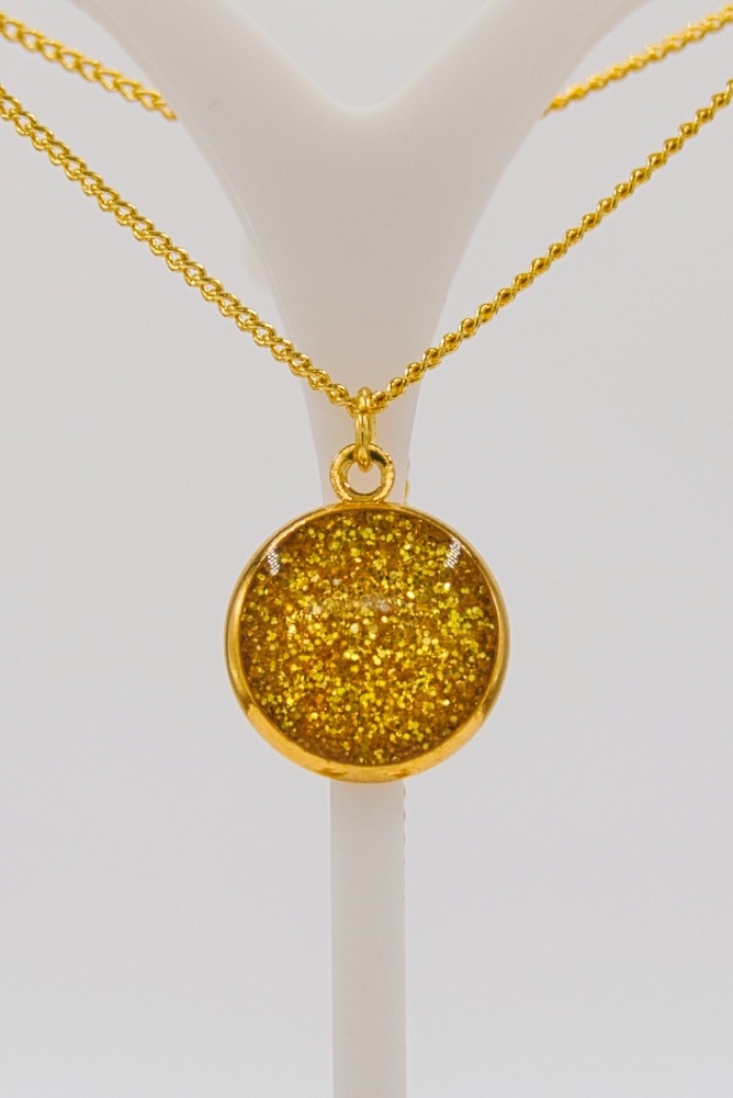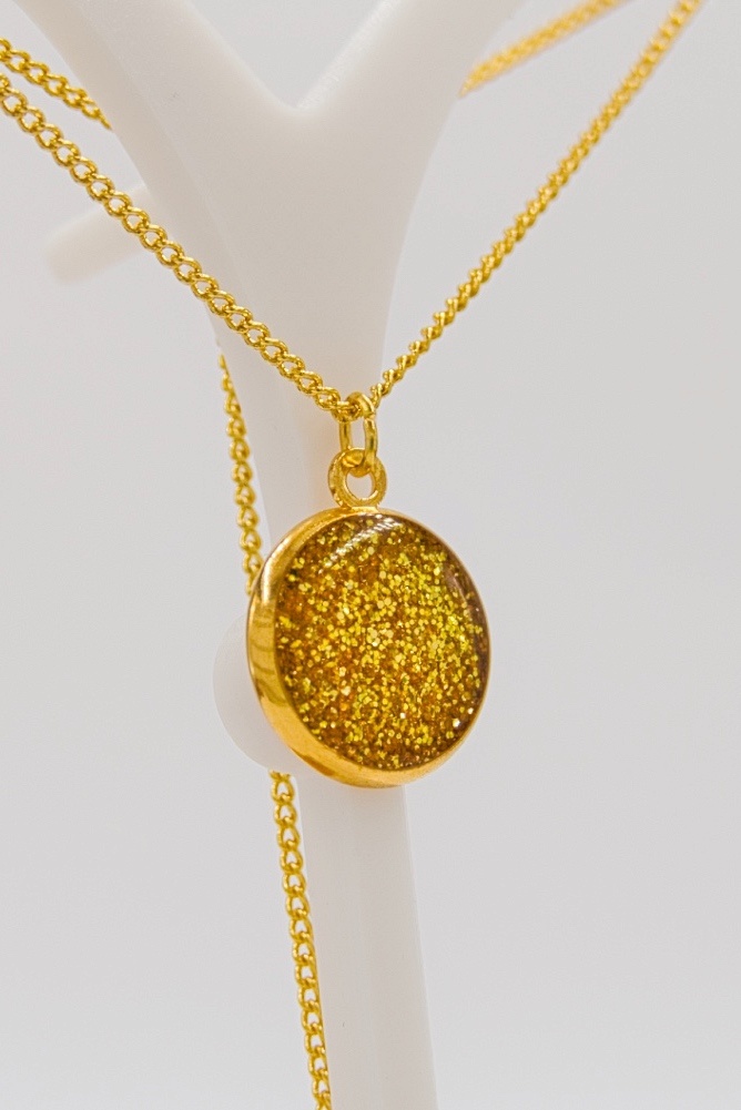 Anhänger: Durchmesser 15 mm; 3 mm hoch; Harz Farbe: Goldglitzer