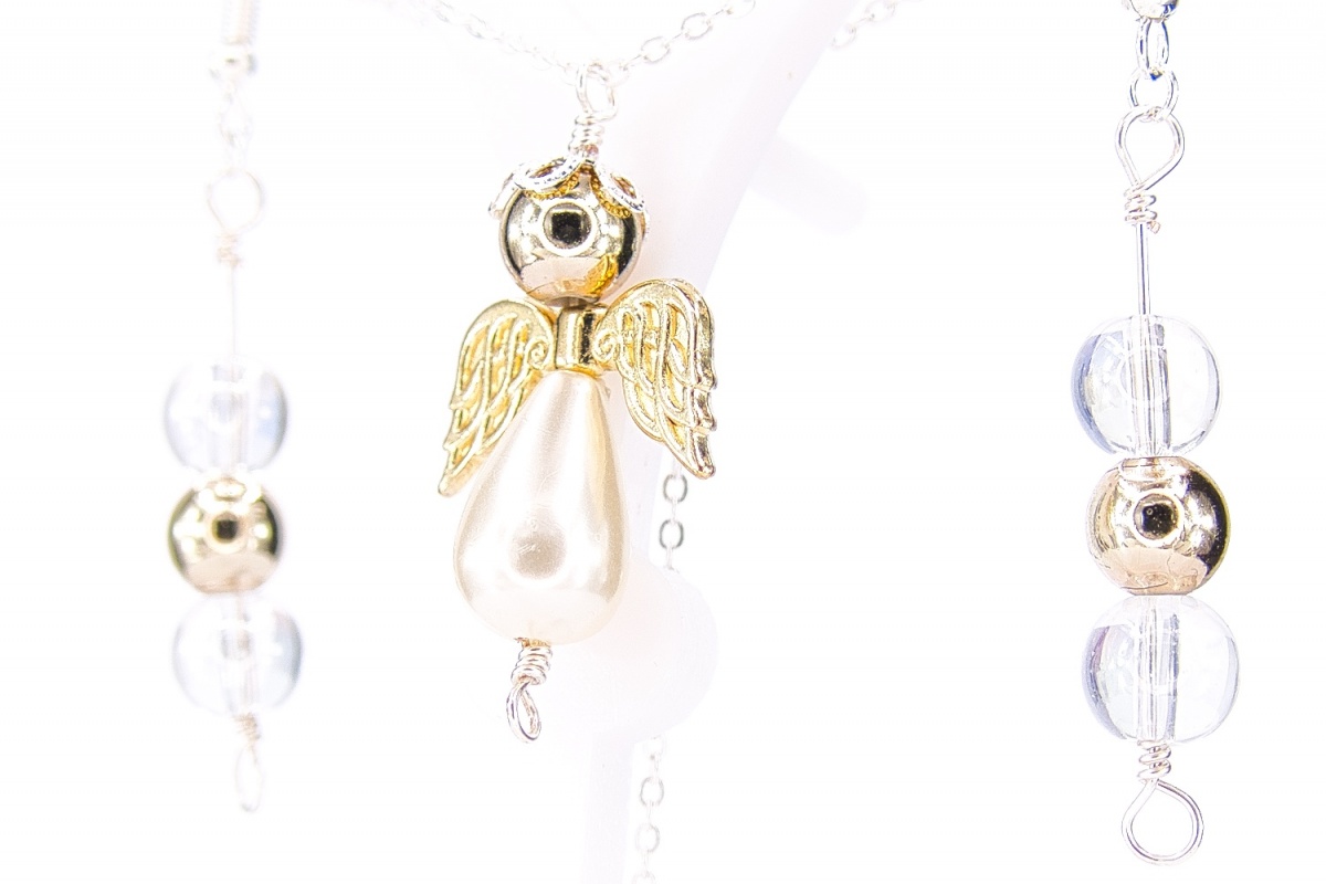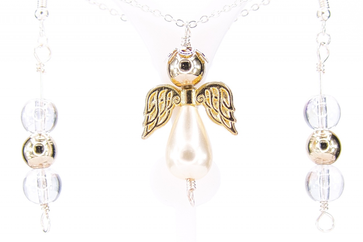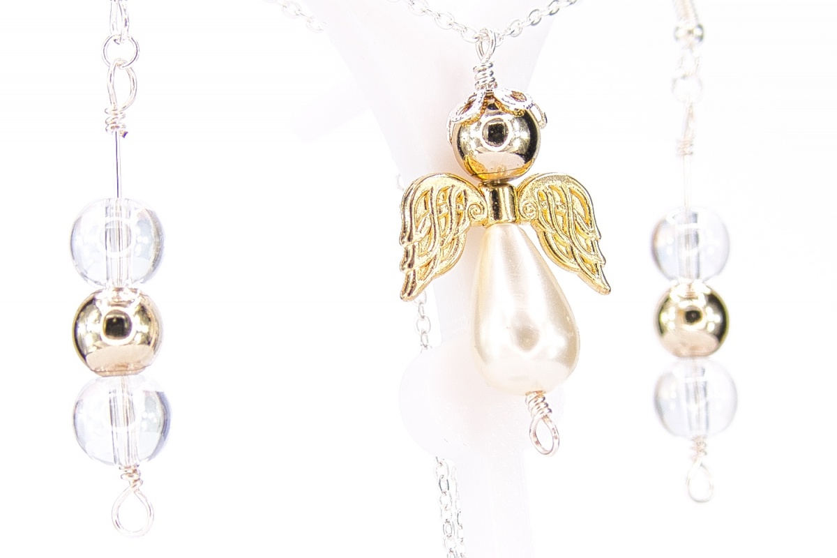 Engel-Halskette mit den Farben Weiß und Gold mit passenden Ohrringen.