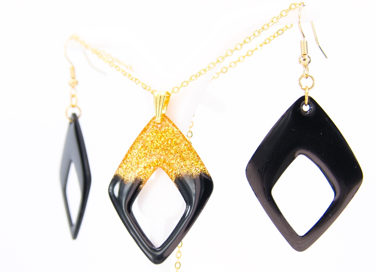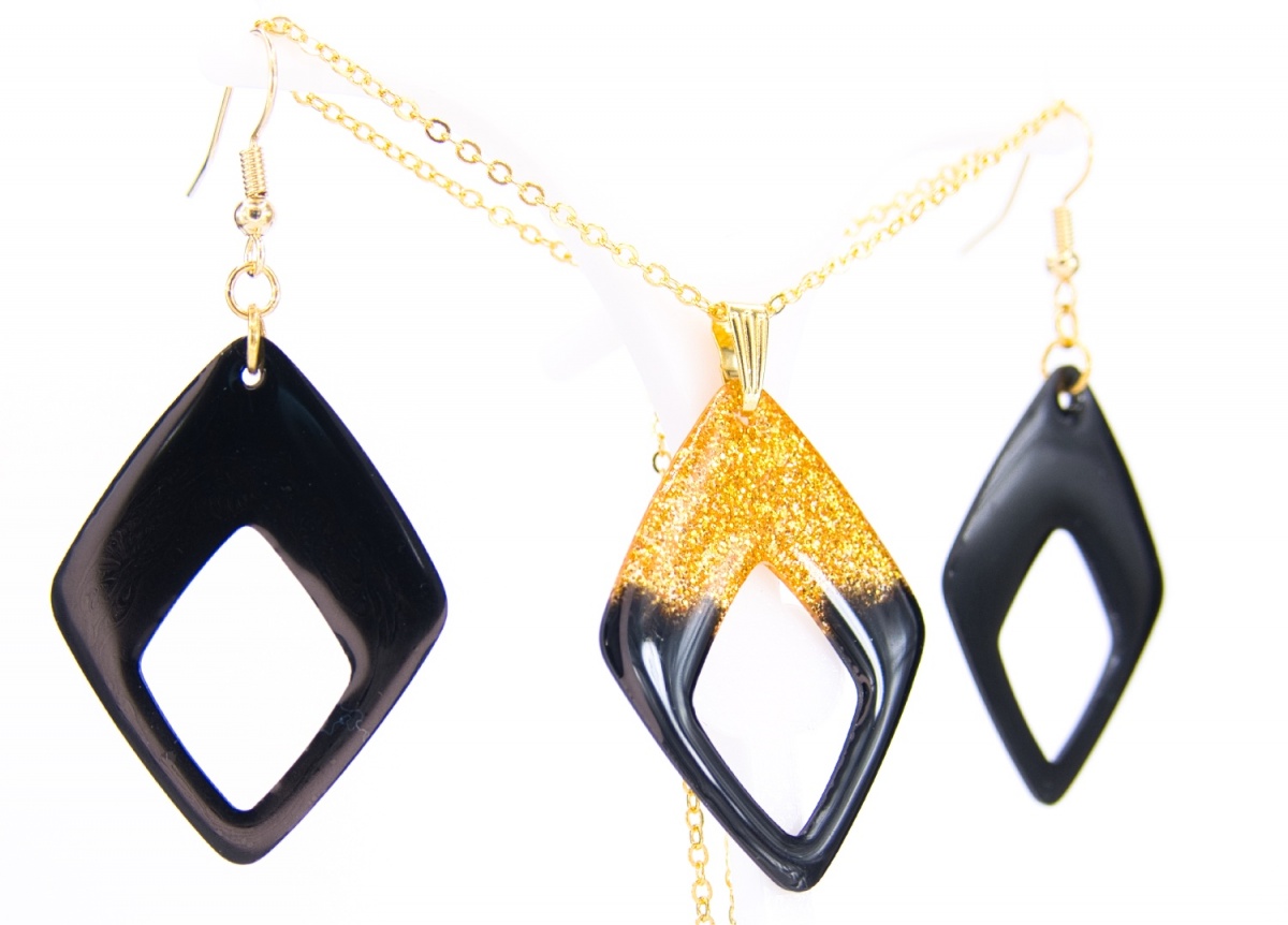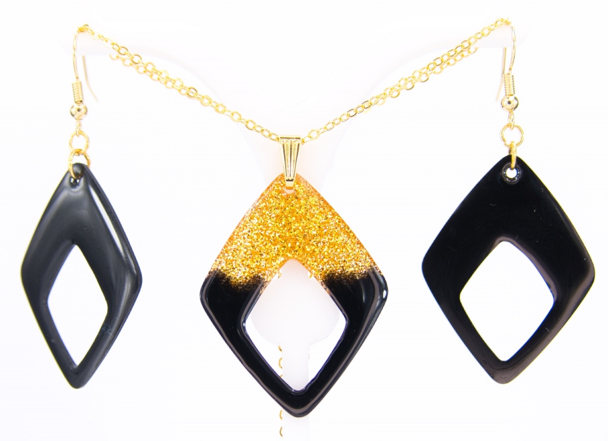 Raute Schwarz Gold Set Halskette & Ohrringe: 50 cm