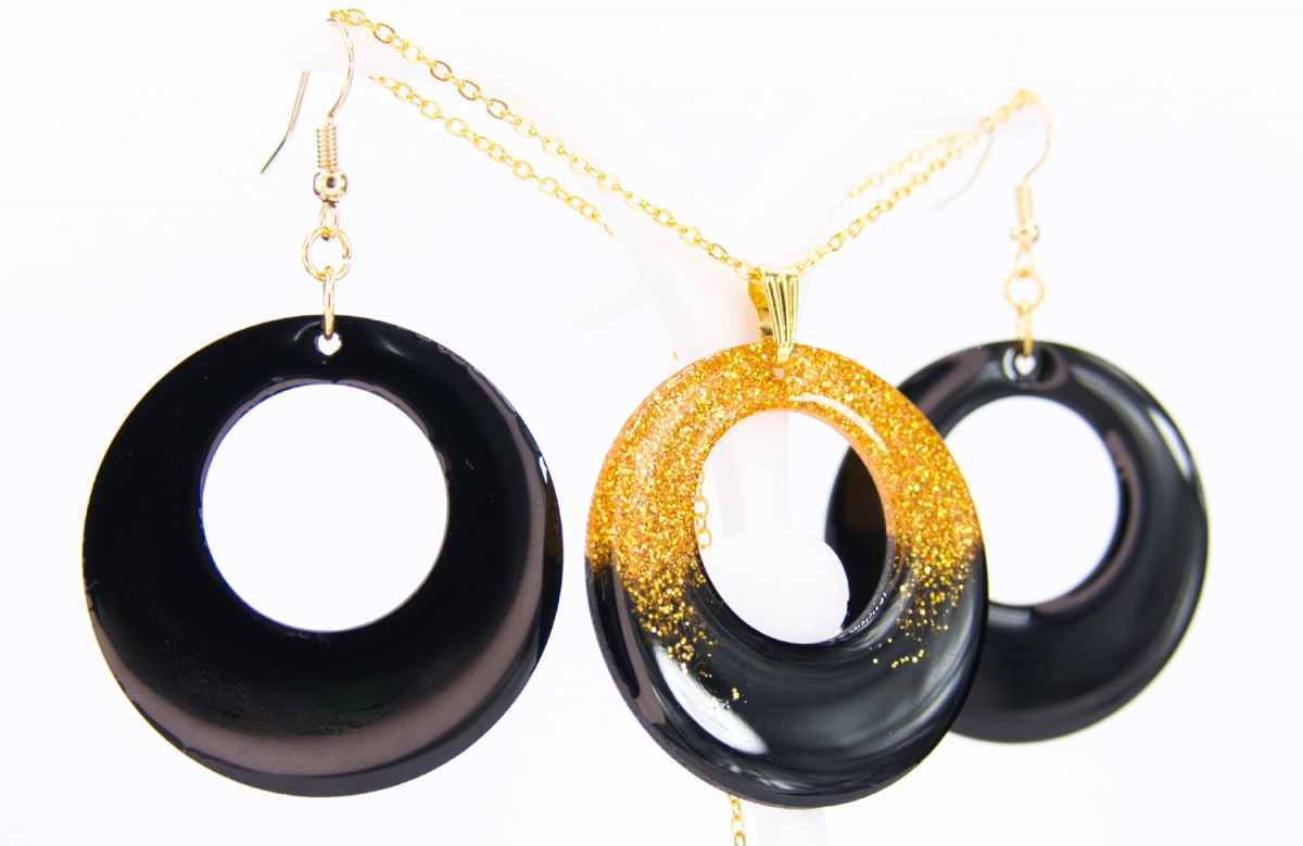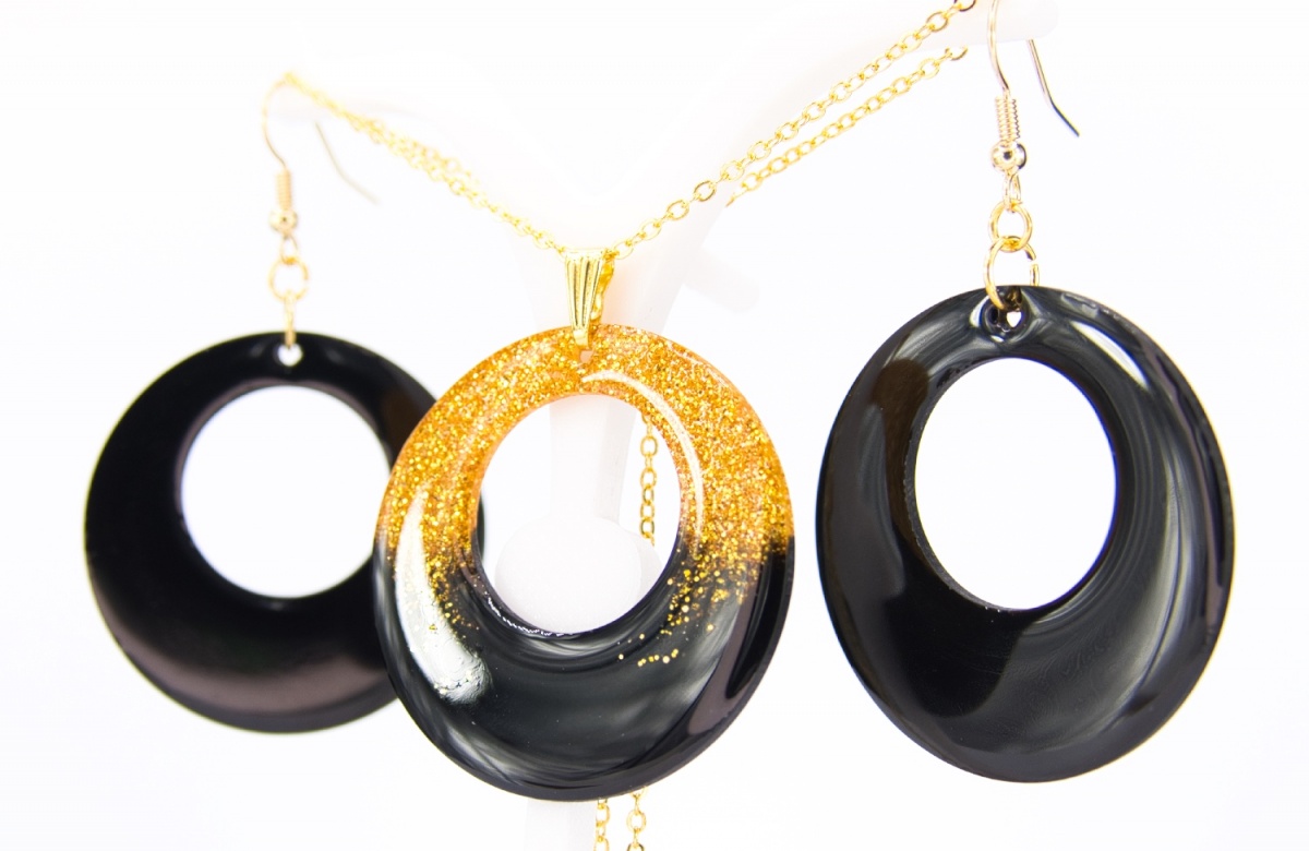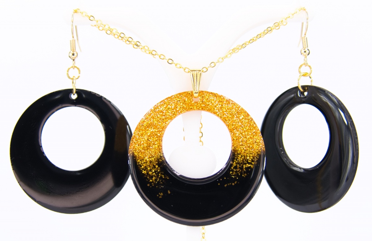 Schwarz/Goldglitzer Rund Set Halskette & Ohrringe: 50 cm